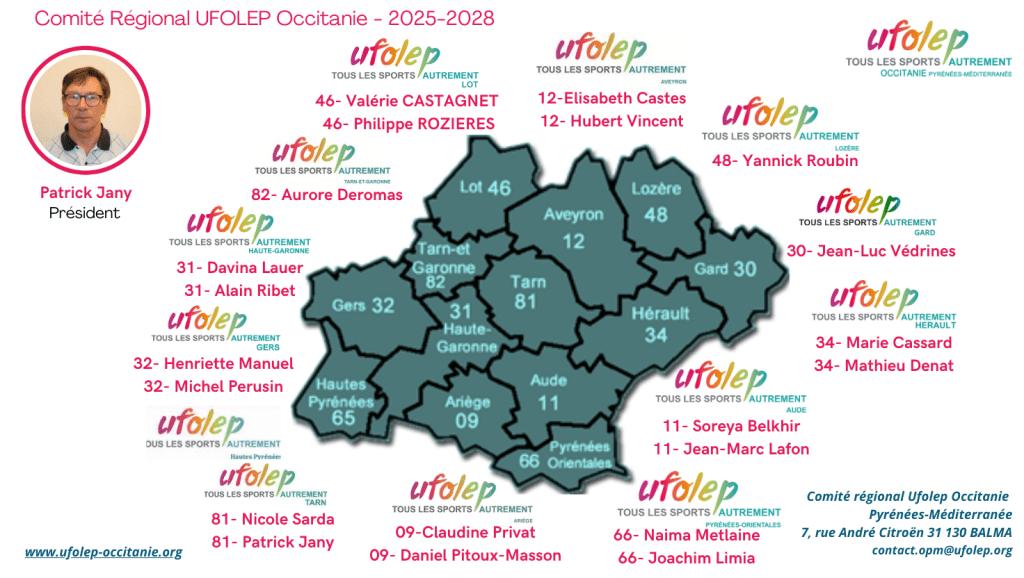 Le comité régional Ufolep Occitanie Pyrénées Méditerranée est composé de 26 membres : deux élus (une femme et un homme) par département. Le comité directeur est élu pour 4 ans et est renouvellé en totalité à chaque année Olympique.