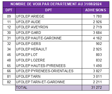 Les mandataires des départements disposent d’un nombre de voix égal au nombre d’adhésions qu’ils représentent, adhésions régulièrement enregistrées entre le 1er septembre et le 31 août de l’année sportive précédant l’assemblée générale (barème : 1 adhésion = 1 voix)